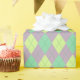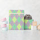 This girly wrapping paper features a cute argyle pattern with purple, green and lime diamonds and green dotted lines.