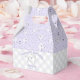 This is an adorable, girly purple & green Halloween 1st Birthday Favour Box. The background features a cute hand-drawn pattern of ghosts, bats, stars and moons on a pastel purple background. The front and back feature a cute ghost on a purple & green gingham pattern personalised with name and date.