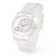 I only have one complaint. I ordered the watch with clear case and strap, and what was sent was white case and strap. I'm going to keep it because 1) it looks very nice in white, and 2) it would take too long to get a replacement made and sent in time for my occasion. Aside from the mix up with the color, the watch does look very good in white. The purple dial is actually sparkly which did not show in the online images. That was a nice surprise. If you like Swatch watches this is very similar to those. It's 33.6mm in diameter, 10.5mm thick, and 40.6mm lug to lug. Stainless steel case back says 3ATM/30m WR, so no swimming or showering or submerging this one. If you like Woodstock, this is a great choice.