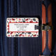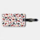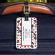 A luggage tag featuring illustrations of perfume bottles, purses, rubies, and retro cat eye sunglasses. Design has a red colour scheme. Personalise the text on front inside sheer area outlined in red.