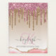 Modern, girly rose gold glitter drips on gold sand brown white ombre background spiral 2024 or any year appointment book and planner. This design features blush pink rose gold and dark yellow gold sparkle glitter drips on gold sand brown white ombre background with name and monogram text template. At the bottom blush pink agate geode with a little gold accent. The name is written with a beautiful swirly hand lettered style script. If you want to keep the swirls/swashes only delete the sample name, leave the square spaces/emoji's in front and after the sample name template. Perfect feminine girly gift for birthday party, wedding, bridal shower, sweet 16 birthday party and baby shower for anyone who like pretty glam things. Please note, this design a printed photo effect with no real geode and glitter. If you need help or matching items, please contact to me.