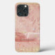 "Girly Rose Gold Glitter Jewel Foliage Script Name and Monogram iPhone 13 Case." Elegant glitz and glam phone case that features, rose gold bokeh glitter sparkle brush stroke paired with layers of blush pink and white diamond dust and jewels. A leaf foliage greenery pattern in blush pink is topped off by a watercolor splatter and brush stroke design that has been graphically designed into gold glitter. Graphically designed by internationally licensed artist, Audrey Jeanne Roberts, copyright.