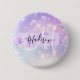 Girly and cute button with a colorful pink, purple, lilac and blue unicorn rainbow hearts sparkly background. Your custom name and monogram are written in an elegant hand lettered script with a lilac purple unicorn paint brush strokes stripe background. A perfect birthday or Christmas gift!