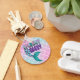 Girly and glam Splashy Sassy purple and green glitter mermaid tail keychain with a pink and turquoise mermaid scales background.