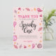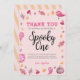 Thank your guests for celebrating your spooky one's first boo day in Halloween style with this cute thank you card! Set with pink background and hand painted ghosts, stars, Halloween candy, and pumpkins. Simply edit with your little one's name and message to truly make it your own. Originally hand painted with watercolors.