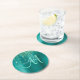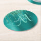 Girly Teal Dripping Glitter Brushed Metal Monogram Round Paper Coaster