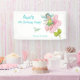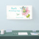 Cute and girly 4th Birthday party banner. Design features an adorable green turquoise girl dragonfly sitting on a gorgeous pink flower and small green dragonfly completes the scene. Personalise this beautiful birthday party banner with girl's name and party details.