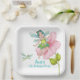 Cute and girly 4th Birthday party paper plates. Design features an adorable green turquoise girl dragonfly sitting on a gorgeous pink flower and small green dragonfly completes the scene. Personalise this beautiful birthday party paper plates with girl's name and party details.