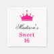Girly white and hot pink Sweet 16 napkin featuring a princess crown and the words "Sweet 16" in hot pink, and your personalised name in an elegant black script. You can change the colour and font of the name using the customise option!