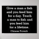 Give a man a fish and you feed him for a day. Teach a man to fish and you feed him for a lifetime. --Chinese Proverb