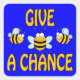 This design features 3 honey bees that take the place of of the word bees so that the caption is Give Bees A Chance. Save the honey bees. No pesticides.