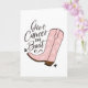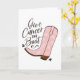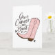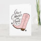 Custom greeting card for Breast Cancer Awareness month or use any time as a get well card, sympathy or congratulations card for breast cancer patients and survivors. The design features a feminine pink cowgirl boot illustration with modern typography design that says "Give Cancer the Boot."