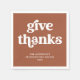 These simple and boho napkins say "give thanks" in retro white typography on a terracotta background, and are the perfect addition to your Thanksgiving or Friendsgiving dinner.