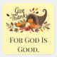 Pretty picture of a cornucopia filled with food, is featured on this Thanksgiving Day square sticker. With message, "Give Thanks For God Is Good", makes this a great sticker to use on those special mailings, decorating, scrapbooking and more!