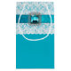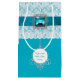 Elegant aqua blue gift bag, with graphics of a white lace look, across the top of the bag. Real looking graphics of a aqua blue satin ribbon, runs through the middle of the lace top, with a silver tone and aquamarine looking gem jewel. A metallic looking ornament style tag, looks like it is hanging down, and has custom text. Personalise the text to read what you want. Matching tissue paper available.