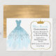 Glamourous Quinceanera birthday party invitation with graphics of a glitzy aquamarine gown, on a white background. A gold outlined decorative text area, on the right side of the invitation is decorated with a golden crown at the top. The back of the invitations is done in a gold tone look. Personalise the text for your daughter's special day.