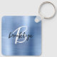 This elegant personalized keychain features a monogram and first name in modern black and white script on a glam blue faux brushed metal background.
