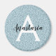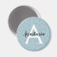 Girly and glam blue silver glitter sparkles monogram name and initial magnet. Personalise with your custom name in an elegant black script and your monogram initial in white. You can change the text colour and font style and size using the customise option.