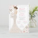 Glamourous bridal shower invitation features a bride in a sparkly, lace mermaid wedding gown and adorned with watercolor flowers in pink and white. Several options available for bride’s hair and skin tone.