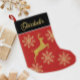 This charming Christmas stocking showcases a nostalgic glam design with a retro touch, featuring a glittery gold reindeer on a classic red background adorned with vintage-style gold snowflakes. The name is customisable in a white, curly script reminiscent of old-school elegance, set against a sleek black background. Order now to add a touch of retro Christmas magic to your home!