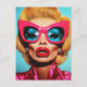 A striking, high-fashion portrait of a glamourous diva with voluminous blonde hair, oversized hot pink cat-eye sunglasses, bold red lips, and electric blue eyeshadow. The look is fierce, retro, and unapologetically fabulous — a pop-art dream in vivid colour.