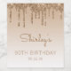 These chic 90th birthday wine bottle labels feature a sparkly gold faux glitter drip border and gold ombre background. Personalise them with her name in brown handwriting script, with her birthday and date below in brown sans serif font.