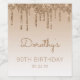 These chic 90th birthday wine bottle labels feature a sparkly gold faux glitter drip border and gold ombre background. Personalise them with her name in brown handwriting script, with her birthday and date below in brown sans serif font.
