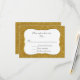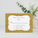 Glamourous wedding response card done in a gold glitter looking background. A decorative gold tone trimmed white text area, in the middle of the card, has black text ready to personalise.
