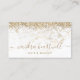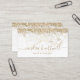 This elegant modern business card features a background image of gold and white marble, framed on the top by a gold faux glitter border. Personalise it with your name in gold-coloured handwriting-style script and your business information in sans serif font. A white gradient screen helps make the text pop. The reverse features gold-coloured text on a matching marble and glitter design. Ideal for hair stylists, makeup artists and aestheticians.