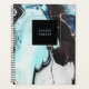 This elegant planner features a modern swirled ink look with shades of black, white, blue, and gold.