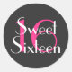 Glam hot pink and white monogram personalised Sweet 16 Sixteen classic round sticker. This pretty sticker features a large hot pink "16" and the words "Sweet Sixteen" in white.