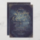 Glamour gold hand lettering calligraphy wedding celebration design and gold dots confetti on dark navy sky night watercolor background, shimmer faux metallic gold glitter effect, modern, chic, elegant and classy, perfect for vintage wedding or winter wedding in evening. Customise your own wedding invitation card.