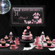 Glamourous French couture-inspired, pink and black "Sweet 16" 16th birthday design featuring a hat box cake, pink stilettos and a makeup bag among various unopened birthday presents and luscious cupcakes. Perfect for celebrating birthday occasions. Age is created in an uneditable faux pink glitter font.