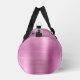 This personalised duffel bag features a monogram and first name in modern black and white script on a glam pink faux brushed metal background.