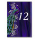 Elegant wedding reception table number card, with graphics of a rich purple coloured satin looking background, with a silver tone flourish running down the left of the card, with a colourful peacock. Personalise the white number, for each table at your reception. Matching products available.