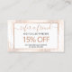 This creative referral card features a delicate background of falling confetti dots in faux rose gold to give the illusion of shimmer. Encourage customer loyalty by having your clients refer a friend in exchange for a discount or promotion. Personalise the text for your own unique offering. A stylish design created for salons, makeup artists, hair stylists, nail salons and more. Original art and design © 1201AM Design Studio | www.1201am.com