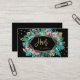 These trendy tropical business cards feature a faux gold geometric frame with a variety of metallic look leaves in gold and green, and pretty pink tropical flowers on a black background. Modern handwritten script in faux gold says "Hair", and there are faux gold social media icons on the back that you can personalise with your username.