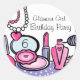 Our Glamour Girl Birthday design is perfect for an especially glamourous young lady on her birthday or anytime. Featuring everything a little girl needs to dress up: nail polish, makeup, lipstick, perfume, hair spray, rollers and jewellery. Purple polka dotted background. Personalise it with your own custom text, even add an age in the compact mirror! On coordinated T-shirts, birthday party invitations, thank you notes and cards, stickers, postage, mugs, tote bags, mousepads, buttons and more! PinkInkArt original!