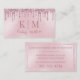 This stylish business card features a glamourous, girly, blush pink coloured background with a foil texture design. Light pink glitter sequins are dripping across the top portion. Monogram initials are placed beneath the glitter, followed by a sample name printed in an elegant script font. The back of the business card features a blush background with a soft pink glitter frame.