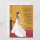 A glamourous bride is poised on red-carpeted steps. She's dressed in a lovely, long gown and bridal veil. In her hand she holds a bridal bouquet of red flowers.