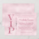 This custom party invitation features a glamourous and elegant theme on a pink foil style background. The VIP title is printed in a soft pink glitter design on the left. A band of pink diamonds separates the text area. It's perfect for a birthday party, bridal shower, or other fabulous celebration.