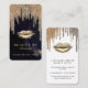 An elegant and glamourous business card perfect for hairstylists, makeup artists, nail art and so much more. The design features a dark moody ink texture background with accents of gold. A faux glitter drip graphic is added to the top of the business card with elegant glam glitter gold lips. Customise with your business name and optional tagline. The reverse side features the elegant glitter drip design along with your contact info and name.