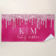 This custom beach towel features a glamourous, girly hot pink coloured background with a foil texture design. Light pink glitter sequins are dripping across the top portion. Monogram initials are placed beneath the glitter, followed by a sample name printed in an elegant script font. You can personalise the towel to include your own custom name and monogram.