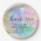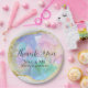 These custom party plates feature an image of a beautiful opal gemstone with a faux gold foil border and accents. The background is a white glitter pattern. The pastel colours appear iridescent. The opal stone are the birthstone for October and are one of the most pretty natural semi precious stones.