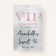 This glamourous VIP all access pass badge features a sparkly, feminine design on a silver background. The VIP title is printed in a soft pink glitter font, followed by the event title. A band of diamonds separates the text. The party or event location and time are printed on the back. It's perfect for a birthday party, sweet 16, bridal shower, or other elegant celebration.