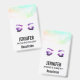 A name tag with a beautiful watercolor painted illustration. Pretty purple eyes and brows, eyes closed showing off long elegant eye lashes.