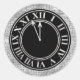 This glamourous custom sticker label features a festive New Year's eve theme. A clock with the time at almost midnight is printed in a faux silver foil on a black background. The border features a frame of diamonds pattern.
