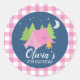 Camping birthday party stickers with pink tent, trees and pink plaid background. Use as an envelope seal or for favour bags