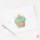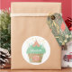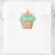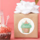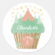 A sweet and chic Glamping, girls camping, birthday party personalised sticker complete with a tent in a forest of trees under gold stars all on a birthday cupcake.