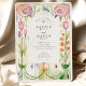 Invite your guests with the distinctive elegance of this Art Nouveau-inspired wedding invitation suite. The design beautifully showcases stylised florals, featuring prominent, softly rendered roses in shades of pink and mauve with a characteristic geometric swirl at their centres. These are gracefully complemented by delicate pink tulip-like blooms and charming clusters of smaller pink and coral flowers with yellow centres, all connected by flowing green stems.